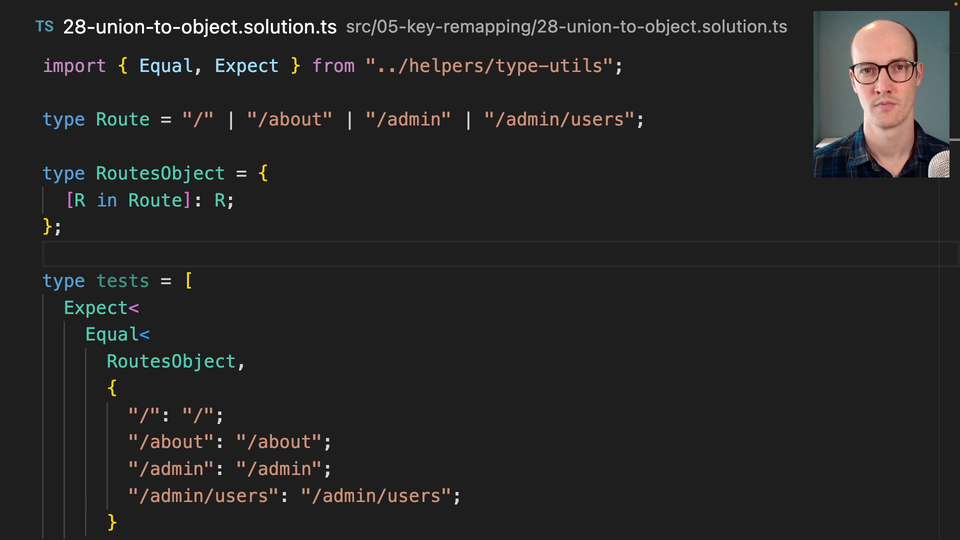 1:22 This is super fascinating. This map type gives you an enormous amount of power in TypeScript due to some patterns that we can use this for later on. For now, what I want you to think about is how would you use this in your day-to-day practice? What can you create out of this? You notice here, we don't have to pass R. We can pass R or undefined. We can do any sort of manipulation we want to.