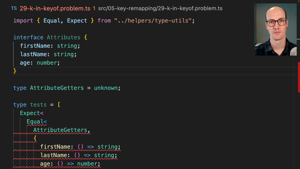 0:07 This object here, we've got this interface Attributes here. What we really want to do is transform this Attributes into a set of getters, which are functions which will return the value here. The age function should return number. The lastName should return string. The firstName should return string.