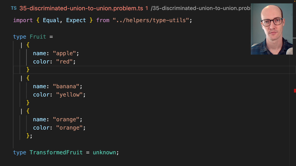 0:00 The goal of this exercise is to take a discriminated union and turn it into a union. This seems like a really, really challenging task until you realize that, "OK, we can use the key remapping to iterate over this."
