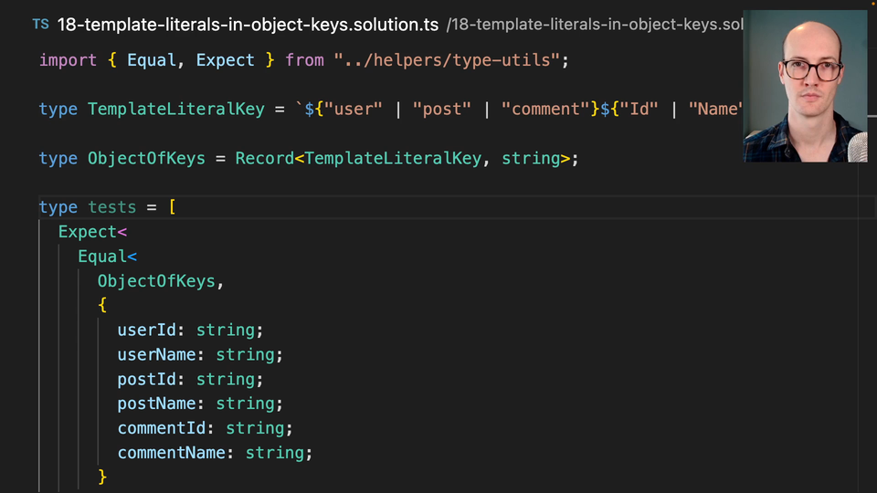 0:00 The solution here is to use a record type where what we're doing is we're basically creating any number of object keys. We want them all to be strings here. What that means is we get this really nice type here where we can just add anything we want this, for instance, admin or something.