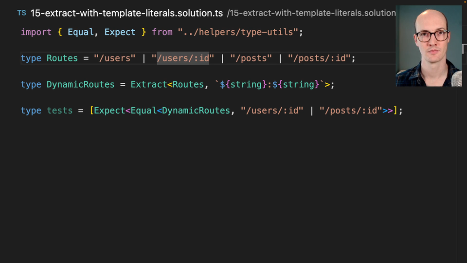 0:46 If I say, let's say, const route is DynamicRoutes here, then I'm only going to get these two options available to me. That means you can start to see that template literals can help in manipulating strings and giving powerful options to your users.