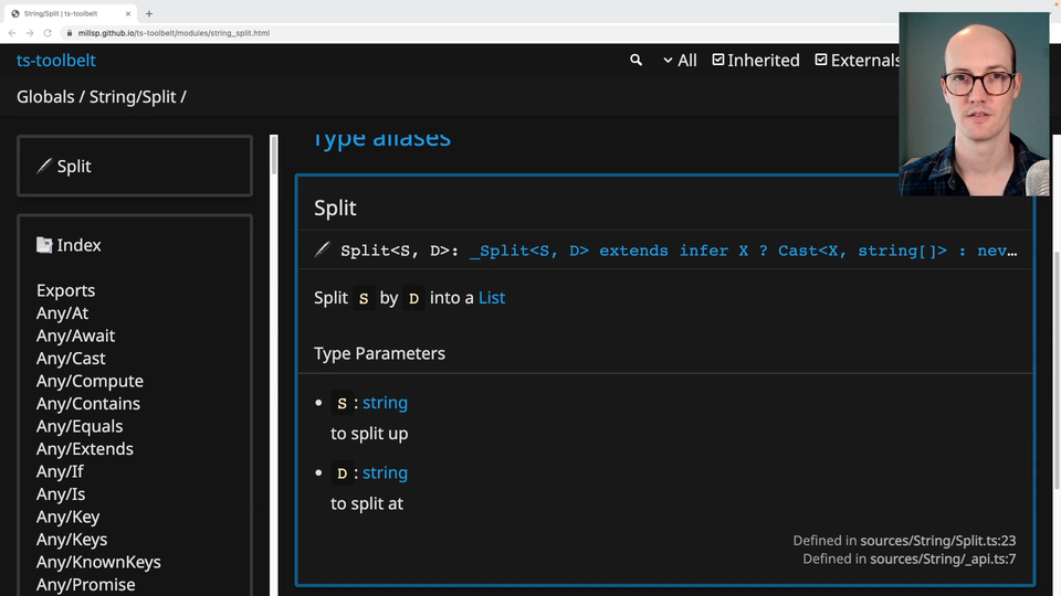 0:39 If we look into Split itself, it's a pretty scary type declaration, and this is beyond the scope of the course, really, to examine most of this stuff, especially beyond the scope of this module.