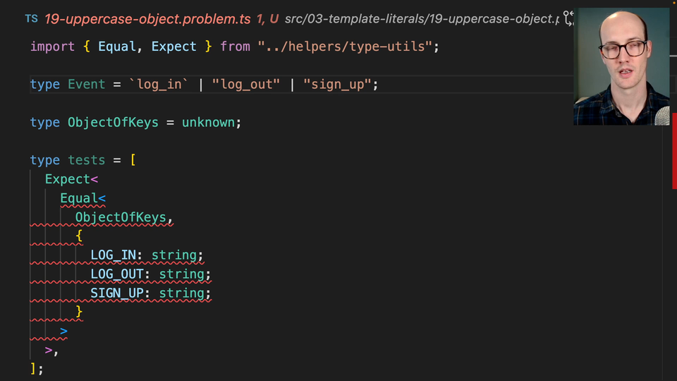 0:00 In this exercise, we have another set of string unions, where we have log_in, log_out, sign_up. We want to create an object based on, very similar to the previous exercise, actually. They're all going to be strings, the values.