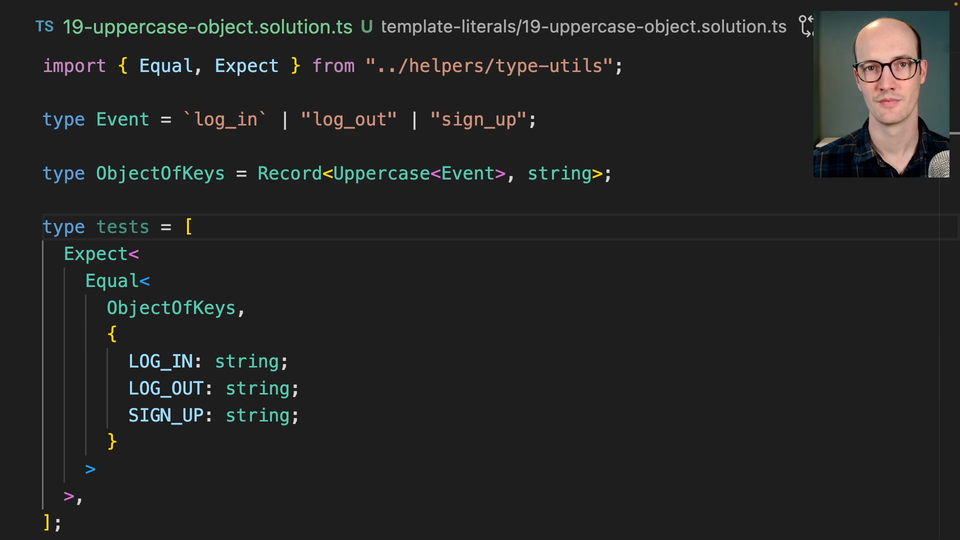 0:10 We're doing the same thing here, except we're not having to do any union stuff, except which is add an uppercase string literal type to them. This is a type helper that's intrinsic to the language and lets you turn a string into an uppercase string.