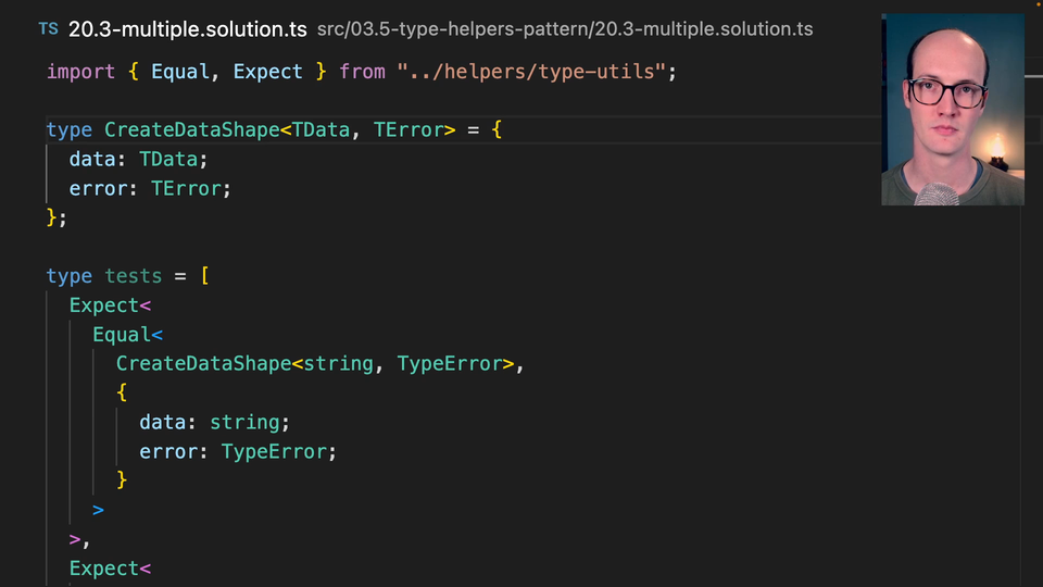 0:00 The solution here is nice and simple. What we have here is a TData and a TError. We can use the comma operator here to specify multiple generics here. We can actually just go as far as we want to. We can go T3, T4, T5, T6.