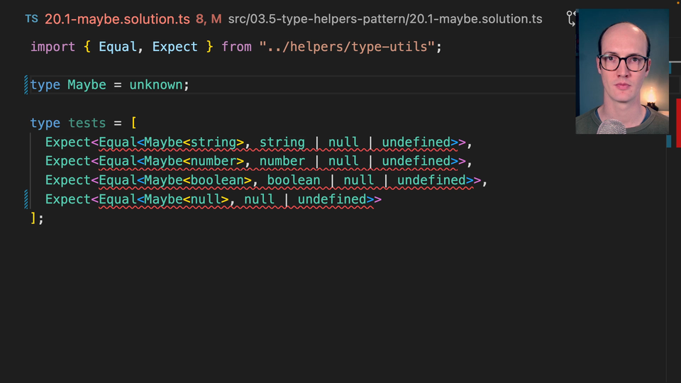0:00 The solution here is to take these Maybe type. We're going to first need to change it into a TypeHelper. We're going to give it some angle brackets and a T. This makes the first argument of our type function here, TypeHelper.
