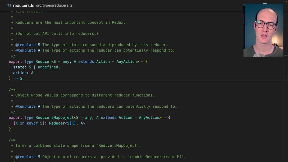 0:15 Now, this file is really interesting because inside here, we basically express a lot about what we want the types in the Redux library to look like. One of them is this reducer type.