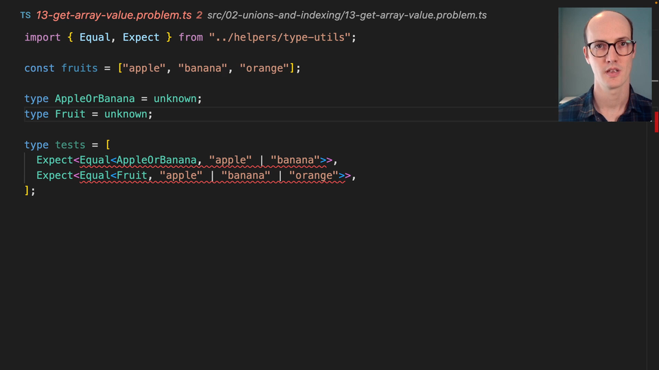 0:08 We know that we're probably going to want the values of that array, so have a little think about that. We also want to say AppleOrBanana equals unknown. We want to get a union of apple or banana in that slot.
