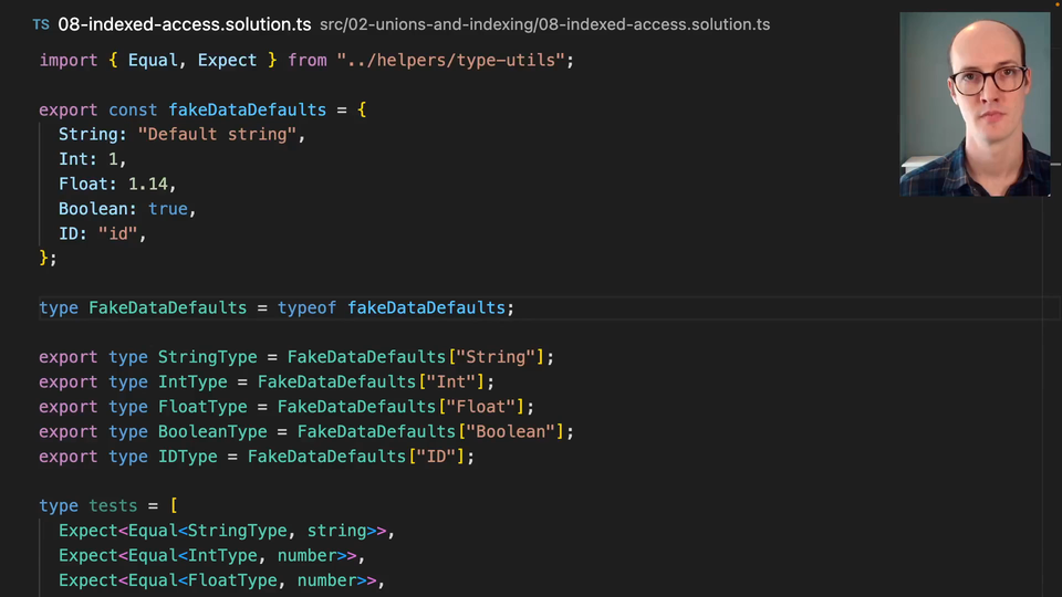0:00 The solution here is to use the indexed access type. This is really cool. We've extracted FakeDataDefaults into its own type here, so String string, Int number, Float number. Then we just index into them using this syntax here.