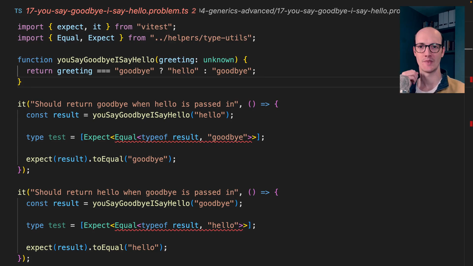 0:10 This all appears to work on the runtime level, but actually, it's not working on the type level. We're expecting result here to be goodbye because we're passing in hello, but we're getting a union type of goodbye or hello. That's interesting. Same is true in the reverse, of course.