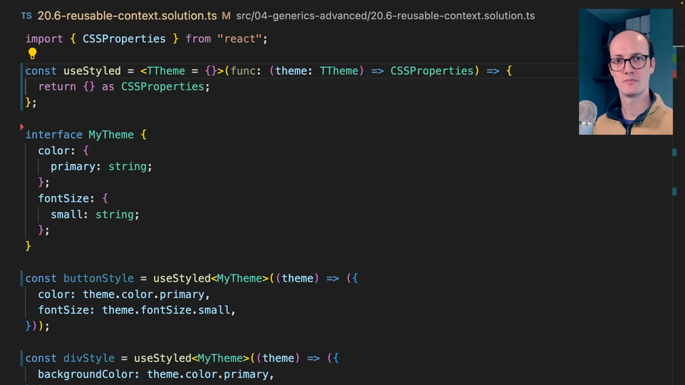0:53 Now, just with that little refactor moving this from there to here, we can now get a fully typed version of useStyled that we can just consume. You can imagine now that useStyled and MyTheme can sit in one module together, and they can export useStyled, and then buttonStyle and divStyle can just consume from useStyled here without needing to pass in a type argument.
