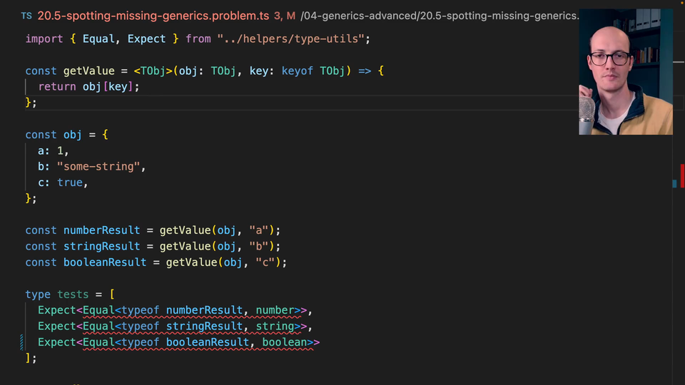 0:00 In this exercise, we have a function called getValue. What this is doing is basically mimicking a property access in TypeScript, where you basically have TObj, which is going to be the thing that's being passed in the first argument. Then the key is going to be keyof TObj there.