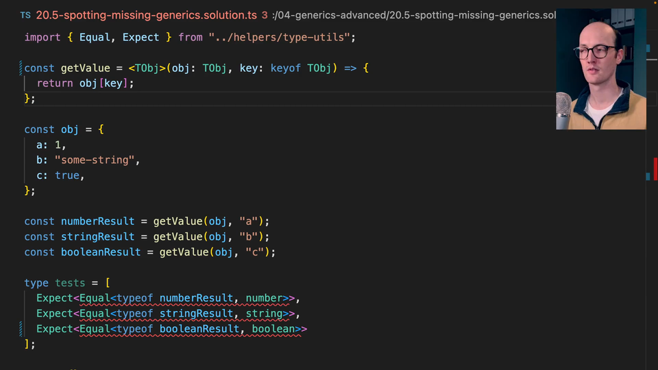 1:30 We say, "TKey extends keyof TObj." Now, we get our beautiful autocomplete back. numberResult,results in number. stringResult results in string. booleanResult results in boolean. That's because what we're doing is we're indexing it with the thing that we capture in this type argument.