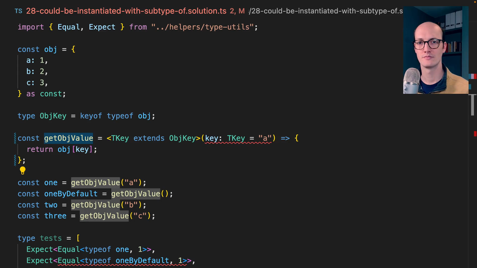 0:00 Let's dive into why this error is happening. The reason it's happening is because getObjValue here, it could be called with a bunch of different things. It could be called with a. It could be called with b. It could be called with c. It could also be called with a union type of those members. It could be called with a or b like this. It could be called with b or c, for instance.