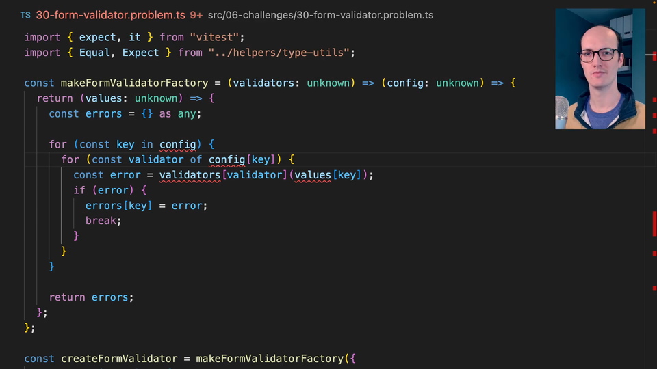 1:13 Then you can't specify a validator that doesn't exist, so this one should be giving you errors if you don't pass in required or something like that. Then the validator that you produce here shouldn't be values unknown. It should be values based on this type that's here.