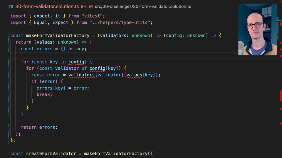 0:00 Let's rock and roll. I'm quite excited about this one. We have some generics we need to capture in type arguments. We need to capture required, minLength, and email. The results of these functions are not generic. They're basically either going to be string or void, is what we're returning. We can either return Required, or we can return nothing, which is void in TypeScript.
