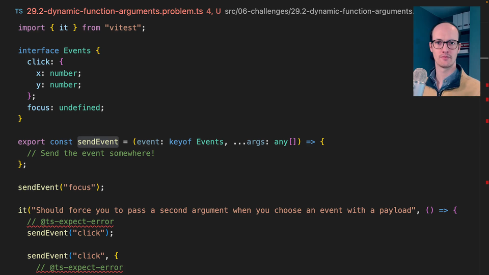 0:44 This is a tricky one because we definitely need a generic in here because we're going to need to capture the result of event. Then we're going to probably need a conditional type, I think, in order to capture the result of, basically, capture the payload and work out how to put it inside the args.