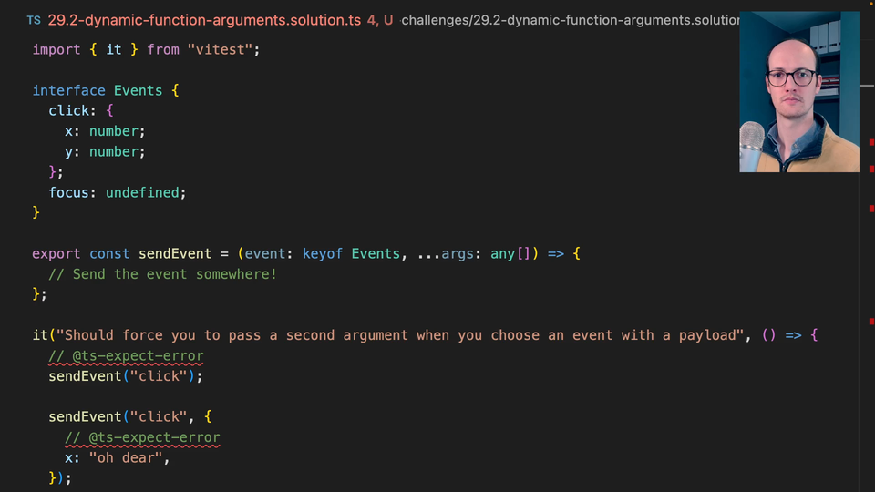 0:54 It's expecting us to pass in undefined here, which is super gross as an API. What we need to do is to revert this a little bit and say args is this. Now, args needs to be an array type or it can be a tuple type. What this means is we have access to Events TEventKey and we can say, if this extends undefined, then what we're going to do is return an empty array.