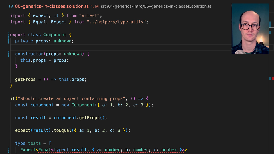 0:54 This is really cool. These are often a really nice place to put your generic types. Because they infer just once really when you instantiate the class, it makes them quite stable. This is a pattern that you'll see often in open source libraries but also in application code too.