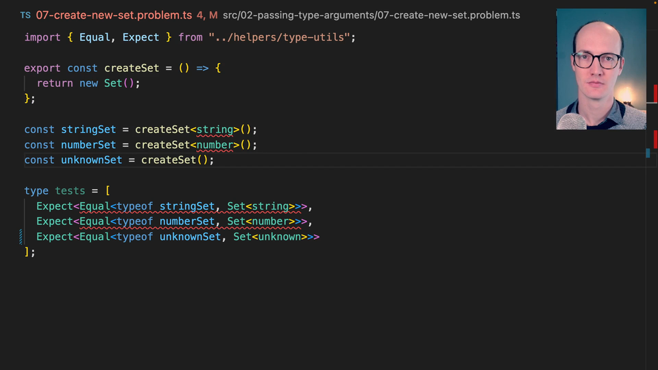 0:22 This stringSet we can see here it's supposed to be Set<string> but actually it's Set<unknown>. This one is supposed to be Set, but it's Set. This one, we're happy with it, being Set. Your job is to figure out what this syntax is all about and how we can change this function to make this syntax behave as expected.