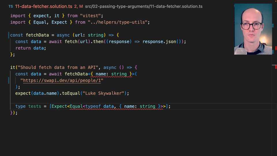 0:00 The solution here is to, of course, add a generic onto here. Let's say TData. Now there's an issue because we have data that's coming down here from this fetch. The interesting thing about fetch is that you can't really pass it any generics.