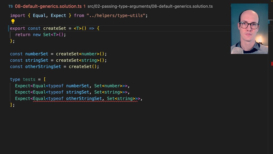 0:00 The solution here is to use a default generic. Just like if we had a type CreateSet type helper, where we would say Set and we'd say it's a T here. Then we would say type Result = CreateSet<number>. We can actually just not pass anything into here and default this to string. Result would be set to string.