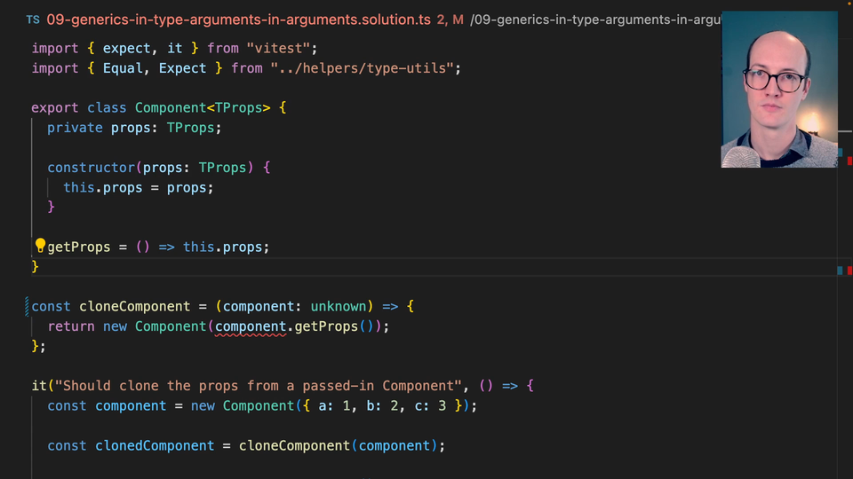 1:34 This also means that we can remove this cleverly enough because it understands that getProps is returning TProps. The component that's being created is going to be a Component<TProps>, and so the function returns Component<TProps>. Isn't TypeScript clever?