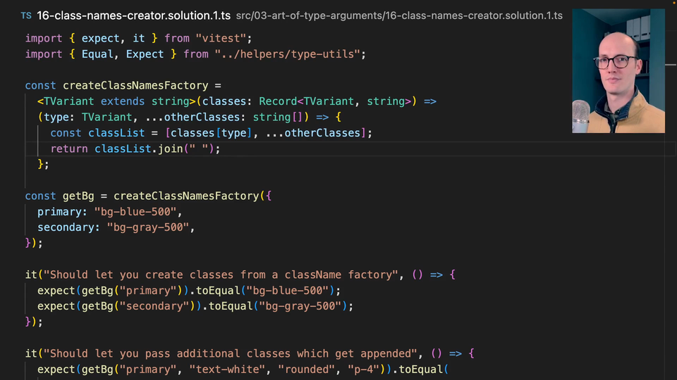1:15 Again, instead of representing TVariant here, then what we get is keyof TClasses. This is a very similar exercise to what we've done before, and you notice that we don't have to work too hard to get all of this beautiful generic inference working.