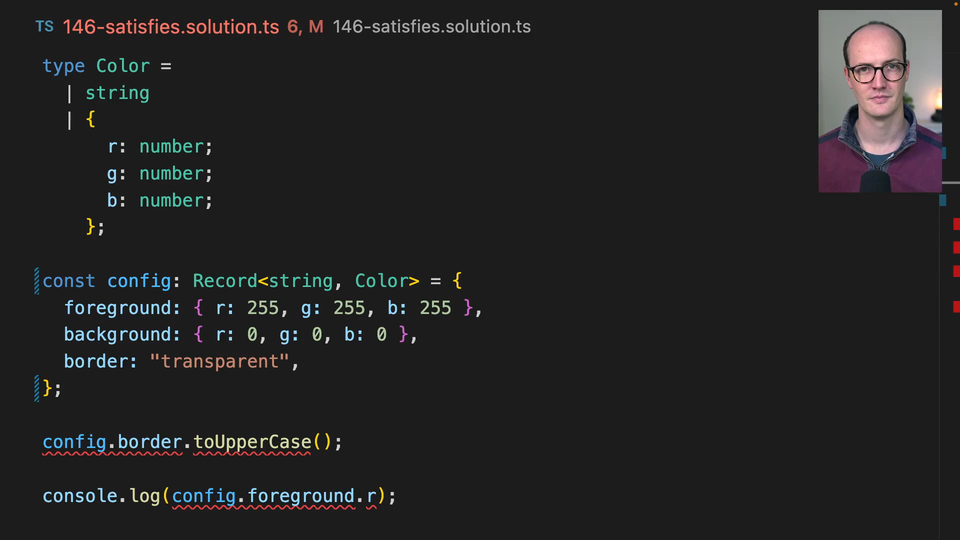 00:16 So config is foreground RGB, background RGB, and border string. This means that we can access config.border.toUpperCase and we get our autocomplete back. So we actually autocomplete background, border, and foreground. Whereas without this, we actually lost all of our autocomplete on config.foreground