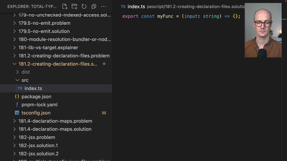 00:00 The solution here is to add inside tsconfig.json declaration true. And declaration true, when that happens, we then get index.js, which is my func here, and then we get index.d.ts, my func input string void.