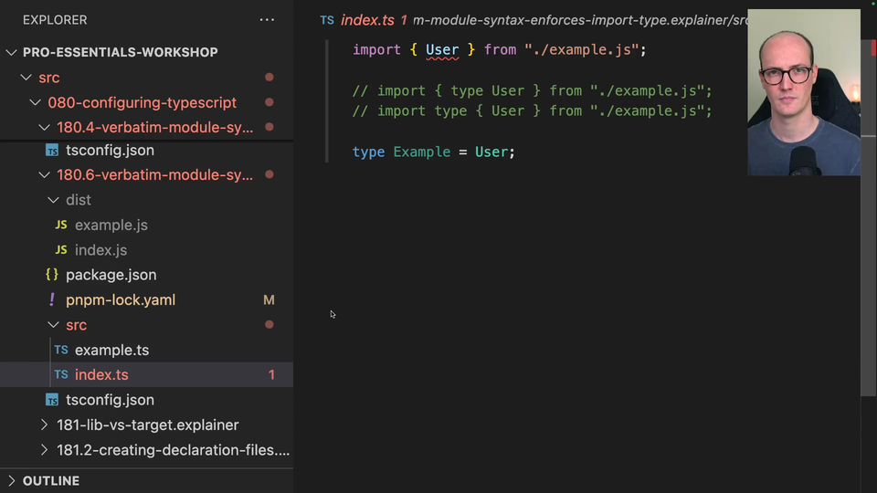 00:16 which just contains a type of user. Now what index.ts is doing is it's importing user from example.js, but we have an error. User is a type and must be imported using a type only import