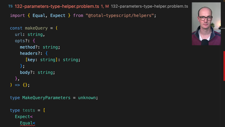 01:15 So we can say opts, and bam, it's all done. But let's say you can't do that. You cannot extract this type manually. What can you do? And there is a type helper that can help you out, and the only thing I want you to do is change this line here, which is the make query parameters type.