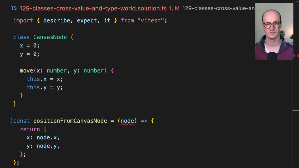 00:00 Okay, so now that we have typeof at our disposal, you might be tempted to say, okay, we're going to say node is typeof canvasNode, like this. But this gets a little bit confusing. Typeof canvasNode, huh? So typeof canvasNode, if we think about it, is actually like a class instantiation.