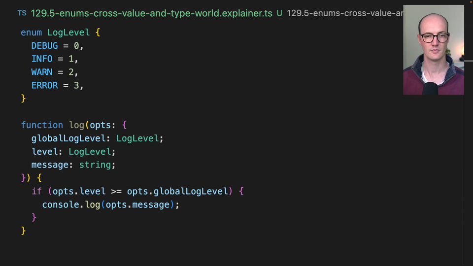 00:16 we don't need to do type of log level or anything like that. And we can just say log level and use it as its type there. So again, these kind of TypeScript features that were added early on, they do have quite nice DX, you know, you can just use them as a value or a type without having to do a type of transformation between them.
