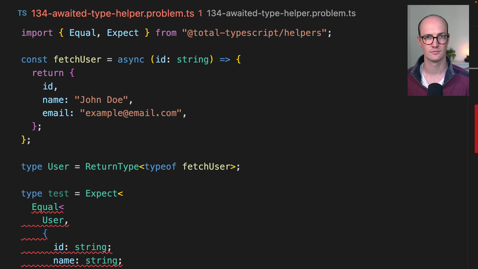00:00 Here we have a FetchUser function, and let's say we're in the same position as in our previous exercise. We want to extract out the return type from it. But FetchUser is an async function. And so instead of a user, what we're getting is a promise wrapping that user. That's pretty annoying. We're not allowed to change anything about this function.