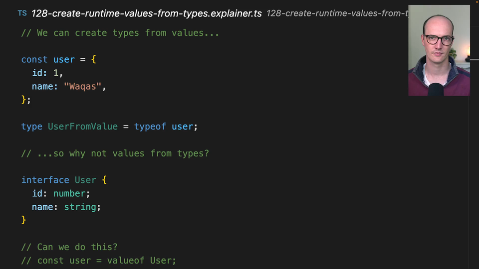 00:18 Why can't we say, so why not create values from types? Let's say we have a user interface here. Can we not say, like, user is value of user or something like that? Turn it directly into a runtime type or a runtime value? Well, if you think about it, this would go against something that TypeScript is trying to do.