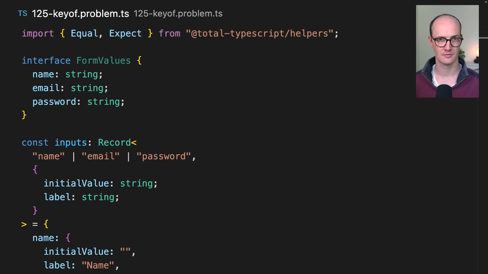 00:00 In this exercise, we have an interface called form values that has name, email, and password on it. Then we have a set of inputs down here, which is a record of name, email, or password as a union. And the members of the record or the values of the record are initial value string and label string.