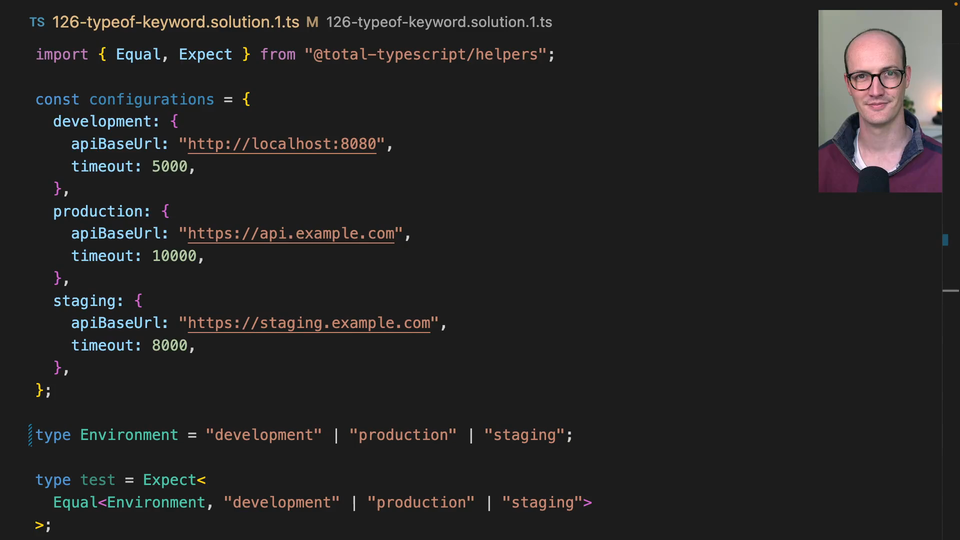 01:11 We've got development or production or staging. Incredible. There's an even simpler solution than this. We don't need to declare this type of in a separate type alias. I just did that sort of for teaching purposes and a really common setup that you're going to see out in the wild all the time is key of type of