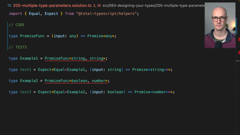 00:00 Okay, so we know that we need PromiseFunc as a type to be generic here. Now, the way that we need to do that is we need to basically say PromiseFunc now takes in some type parameters. You might think, and you might have seen this syntax before if you vaguely looked at this, that you might need to put the syntax here.