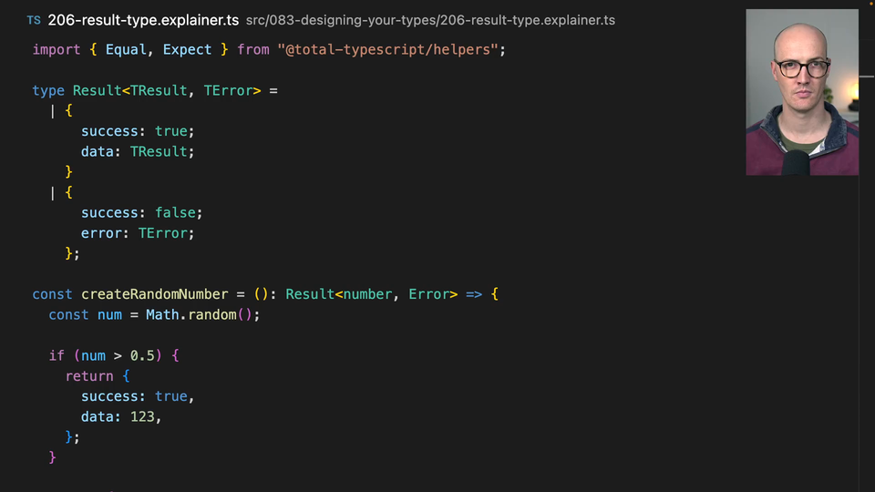 00:51 And so when we get this result back, we can actually check if result.success, we end up with result.data and it's typed as number. If I were to make a change here and say result.string, then it's going to yell at me if I don't return the right thing in the right branch because type number is not assignable to type string.