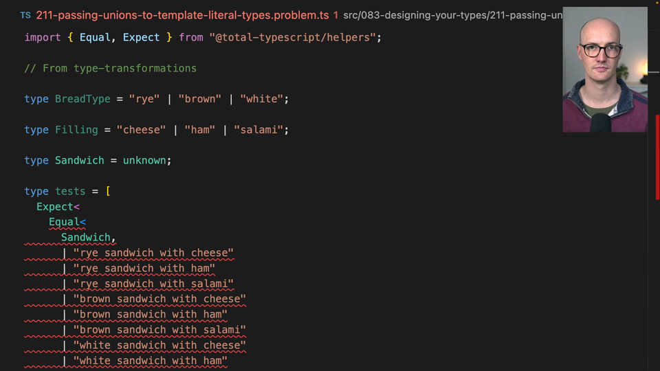 00:18 which ends up being these various possibilities. Your job is to try to work out the most efficient way to type this sandwich type while essentially using as few lines of code as possible. You can do this in a single line of code using template literal types. Good luck.