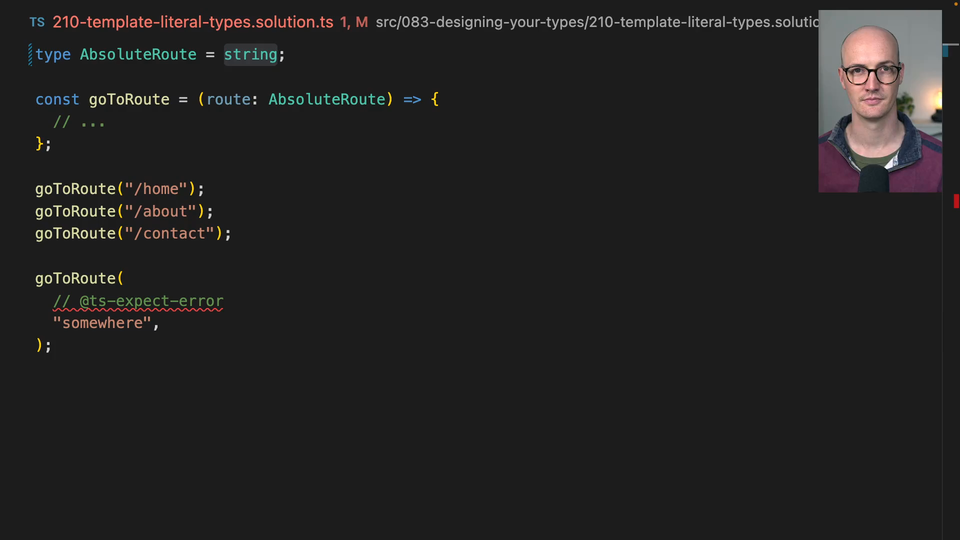 00:00 Okay, the solution for this is so cool. You have template literal types in TypeScript, which are kind of like literal types or literal strings on steroids. Instead of doing something like this, where we say forward slash home or forward slash about or forward slash contact, we want to basically say, okay,