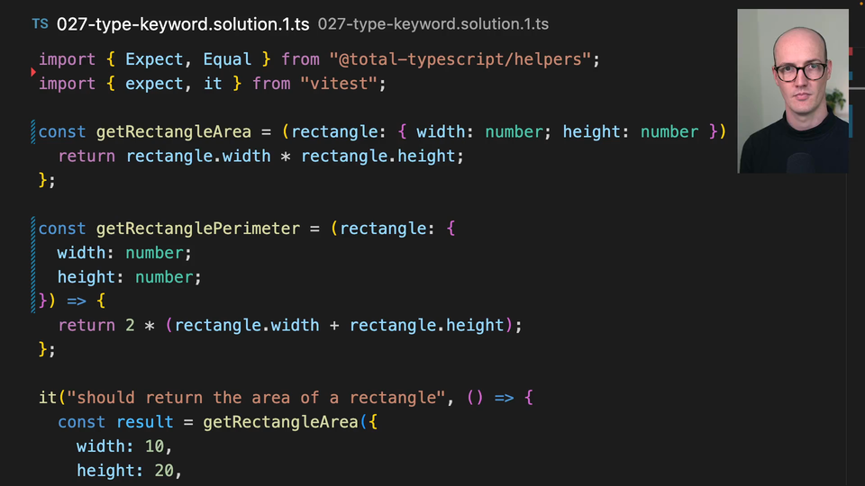 00:00 So for this solution, we're going to use the type keyword and we're going to say type rectangle equals width height or width number height number there.