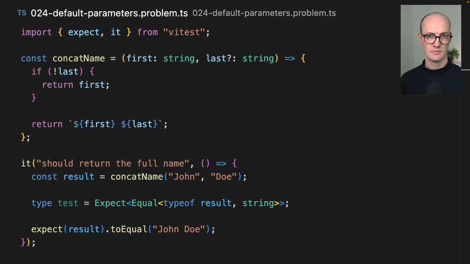 00:00 In this exercise, we have our CONCATNAME function back and everything looks like it's going okay, except for if you look in the tests here, it's expecting expected John to deeply equal John Pocock. And this is down the bottom here. It's expecting that when you call CONCATNAME with just John here,