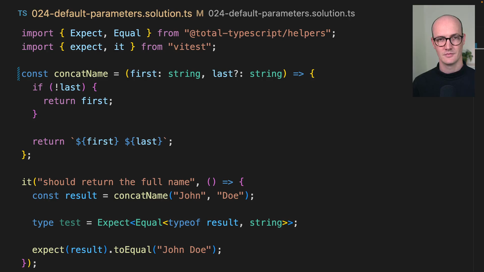 01:15 that you're initializing it to a string, it understands that this should be typed as a string. TypeScript is pretty clever that way as you'll see. So this is how you do default parameters in TypeScript.