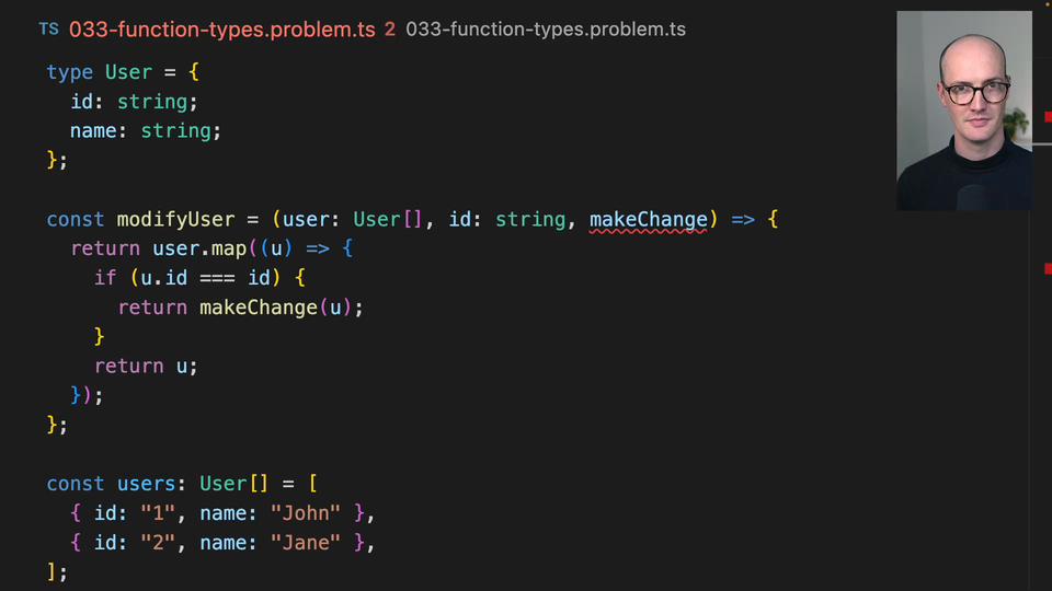 type User = { id: string; name: string;};const modifyUser = (user: User[], id: string, makeChange) => { // red