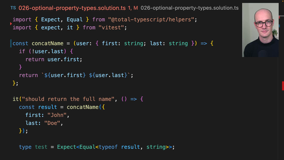 00:28 there. You'll see that on concat name here when we get autocomplete on it we can specify first we'll say John and then we can also specify last and we can pass in undefined there if we want to. That's super duper nice because it means that TypeScript sort of it lets you just be so much