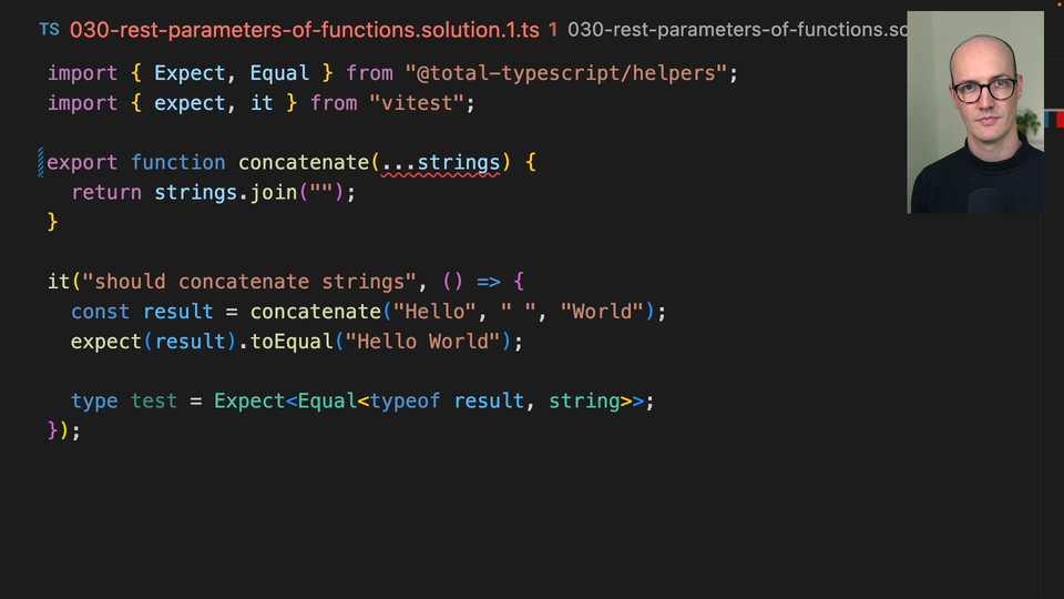 00:00 So the solution here is relatively simple. We know that this is just an array of strings because that's how rest parameters work in JavaScript. If you specify it like this, then all of the arguments passed to that rest parameter will end up as an array passed to the function. So we can just type this as an array.