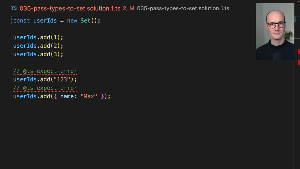 01:12 We could also have done this a different way where we could actually type user IDs here So we can give a type to the variable to user IDs. We can say whatever's in this slot here It has to be a set of numbers and so new set here It's sort of infers backwards TypeScript is so smart in these situations because it knows
