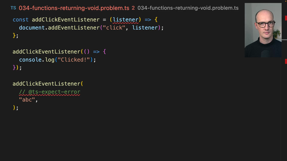 00:00 Let's look at a classic example from the web development world where we have addClickEventListener. What we're doing here is we're saying the document we want to add a click event listener and then pass that listener to it. And what we want to do is when we call it, we want to pass in a function here and we don't want to return anything from that function.